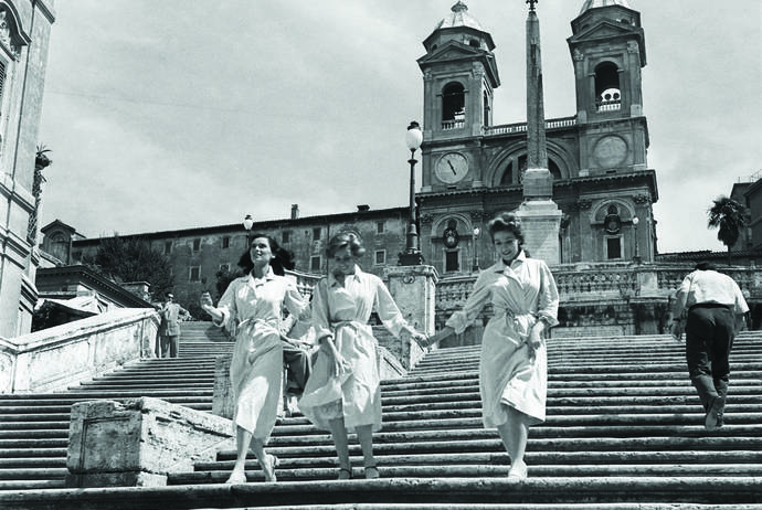 Our story begins at the end of World War II, after the allied troops disembarked in Sicily and the partisan groups mobilized in the center-north to liberate the country from the fascist regime. Italy exits the global conflict ravaged by bombs and reduced to shambles. But one of the industries to land on its feet was the citadel of cinema, Cinecittà, which was built by the fascists on the outskirts of Rome in the 1930s. (The regime was conscious of the importance of mass media, then-dominated by radio and film.) After the war, Cinecittà managed to attract major international producers who helped the world discover the city, and Italy.