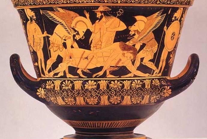 This exquisite krater showing the death of the warrior Sarpedon is the Sistine Chapel of Greek pots, an unexcelled masterpiece. It was made by the potter Euxitheos and painted and signed by Euphronios, leader of the group of artists who transformed black-figure vase painting to the far more sophisticated red-figure during the golden age of Athens in the early Sixth Century BC.