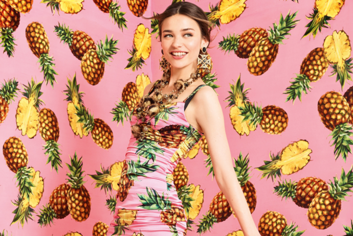 The Dolce and Gabbana spring/summer 2017 ‘Tropical City’ collection is a celebration of sun and joy… at the tropics. Funny pineapples on a bright millennial-pink background cheer up short and long dresses, bags, and even shoes. This triumph of colors and vivacity recall a tropical-like atmosphere and set you in the right mood to live your summer at its very best. The Dolce and Gabbana’s unmistakable style and aesthetics do all the rest.