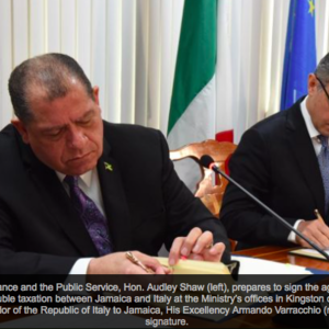 The Government of Jamaica has signed an agreement with the Republic of Italy for the elimination of double taxation with respect to taxes on income and for the prevention of tax evasion and avoidance.