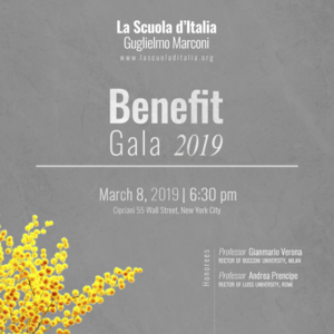 “Eccellenza nell’Educazione", questo il tema del Benefit Gala 2019 della Scuola d’Italia Guglielmo Marconi che si terrà Venerdì 8 Marzo e che vedrà riunita la comunità italo-americana nella bellissima sede di Cipriani Wall Street.